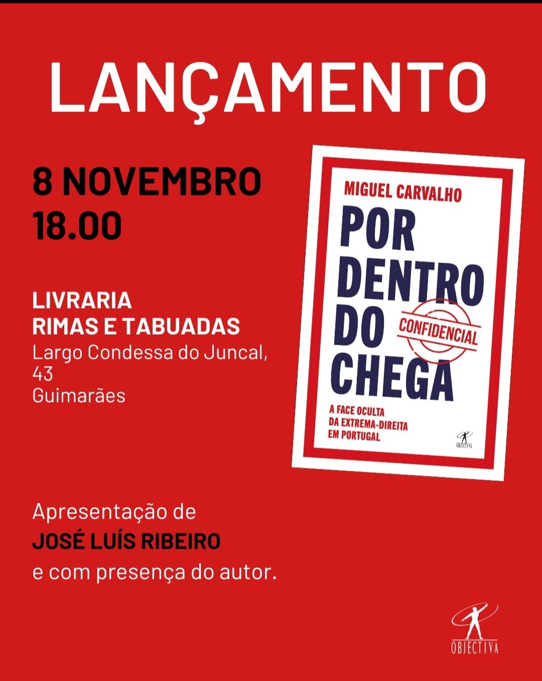 No dia 8 de novembro, Guimarães recebe o lançamento do livro "Por dentro do Chega - A face oculta da extrema-direita em Portugal", da autoria do jornalista Miguel Carvalho. O evento contará com duas apresentações, a primeira às 18h00, na Livraria Rimas e Tabuadas, com apresentação a cargo de José Luís Ribeiro e com a presença do autor, e a segunda às 21h30, na Sociedade Martins Sarmento, com apresentação realizada por Delfim Machado e Inês Lago e com presença do autor.