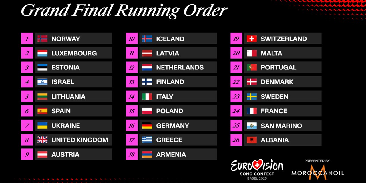 O alinhamento para a grande final da Eurovisão 2025 é este pela seguinte ordem: