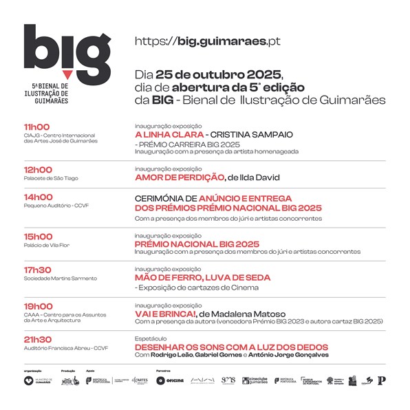 Às 12h00, o Palacete de São Tiago recebe a exposição “Amor de perdição”, de Ilda David. Já às 14h00, o pequeno auditório do Centro Cultural Vila Flor (CCVF) acolhe a cerimónia de entrega dos Prémios Nacionais BIG 2025, com a presença dos membros do júri e dos artistas concorrentes.