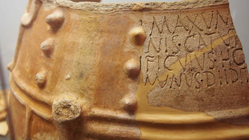 Pormenor do vaso com inscrição, recolhido em 1951, na Citânia.